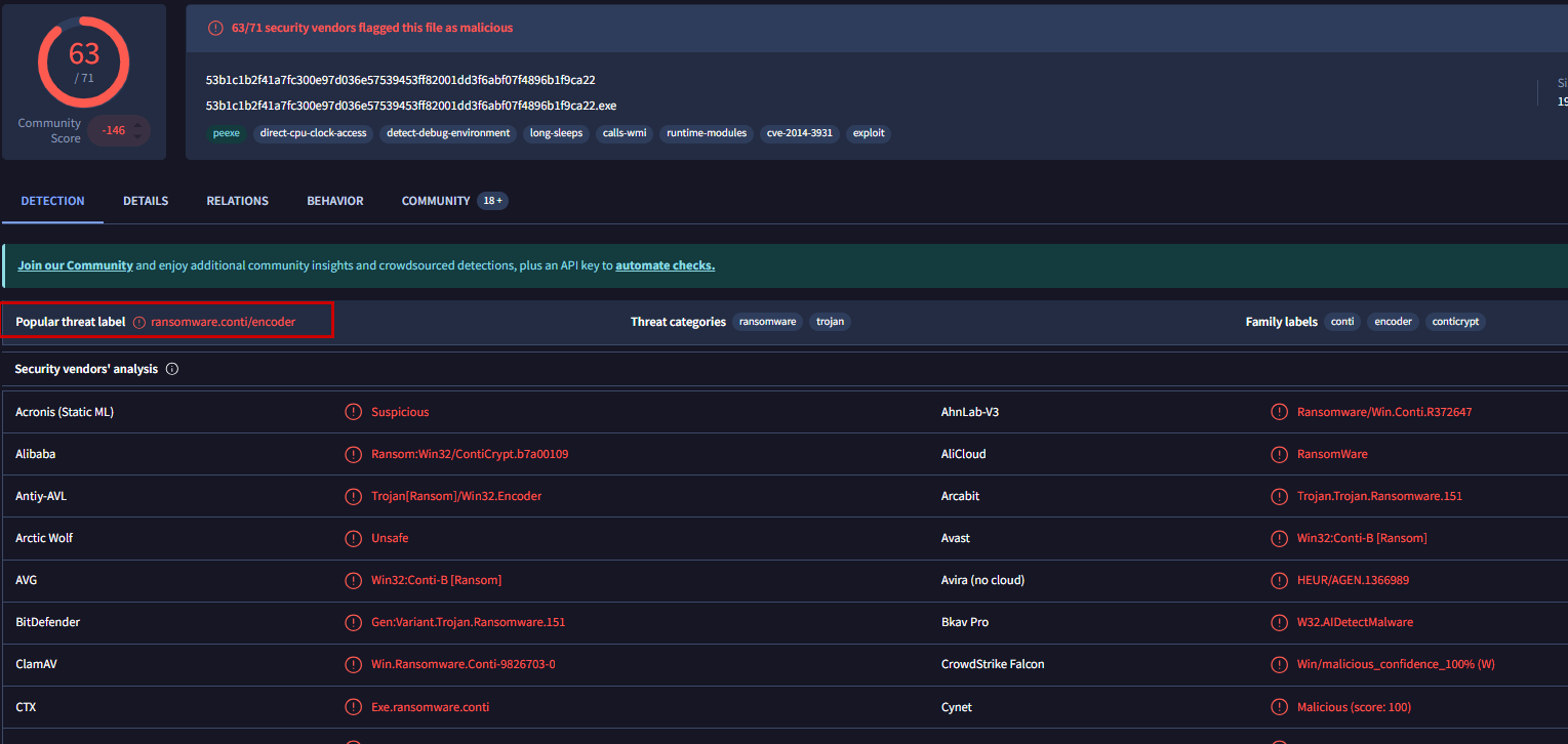 The VirusTotal analysis shows that the hash is flagged as malicious and identified as Conti ransomware , confirming that the dropped cmd.exe is a malicious ransomware payload.