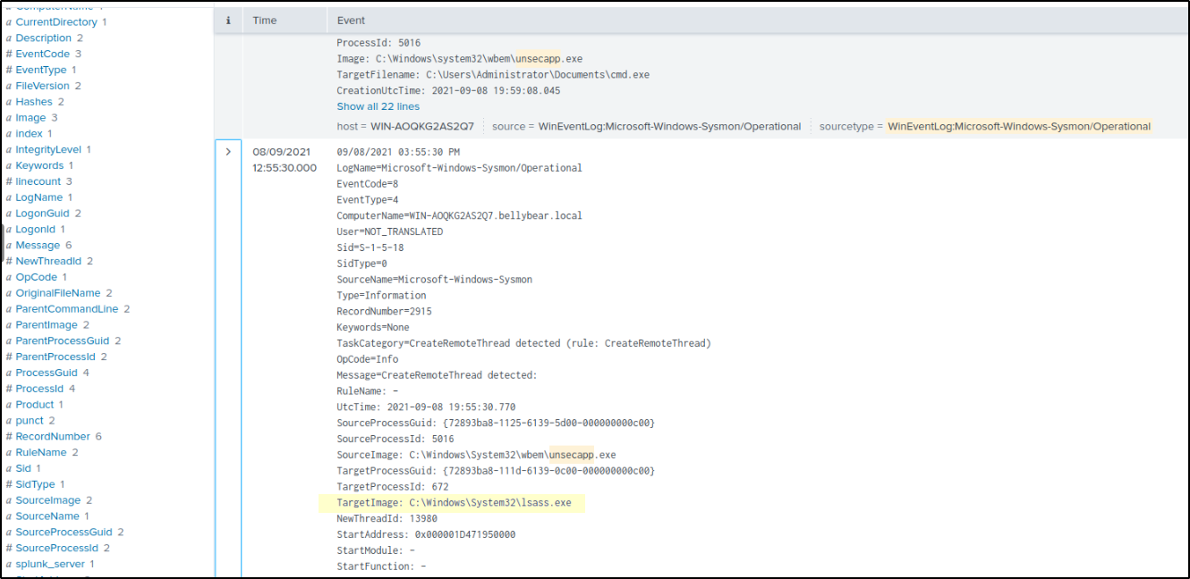 Furthermore, unsecapp.exe was observed interacting with lsass.exe, a classic sign of an attempt to harvest credentials from memory. The logs specifically show unsecapp.exe creating a remote thread inside lsass.exe (Sysmon Event ID 8). This confirms process injection, where the attacker inserts malicious code directly into the LSASS process space. Once running inside LSASS, the injected code can bypass standard access controls to scrape NTLM hashes, Kerberos tickets, and cleartext passwords directly from memory. While Event ID 8 represents the injection itself rather than the final read operation, it is the critical enabling step for stealthy credential dumping that often bypasses detections looking only for Event ID 10 (ProcessAccess).
