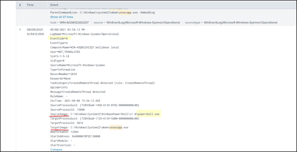 Analyzing the Event Code 8 (CreateRemoteThread) logs reveals that PowerShell was interacting with unsecapp.exe. This indicates that a malicious script running in PowerShell injected its code into the unsecapp.exe process. By “migrating” execution in this way, the attacker can continue their activity under the guise of a legitimate Windows process, effectively evading detection that might be monitoring PowerShell for suspicious behavior.