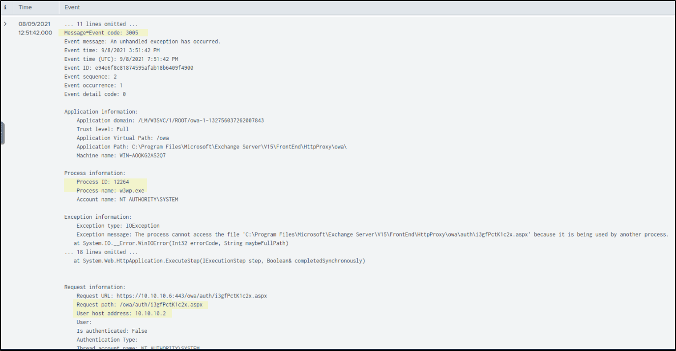 Another log Event ID 3005 from w3wp.exe shows an error that the .aspx file was already in use. This indicates the file was actively being accessed by the web server, confirming it was not just uploaded but also executed.