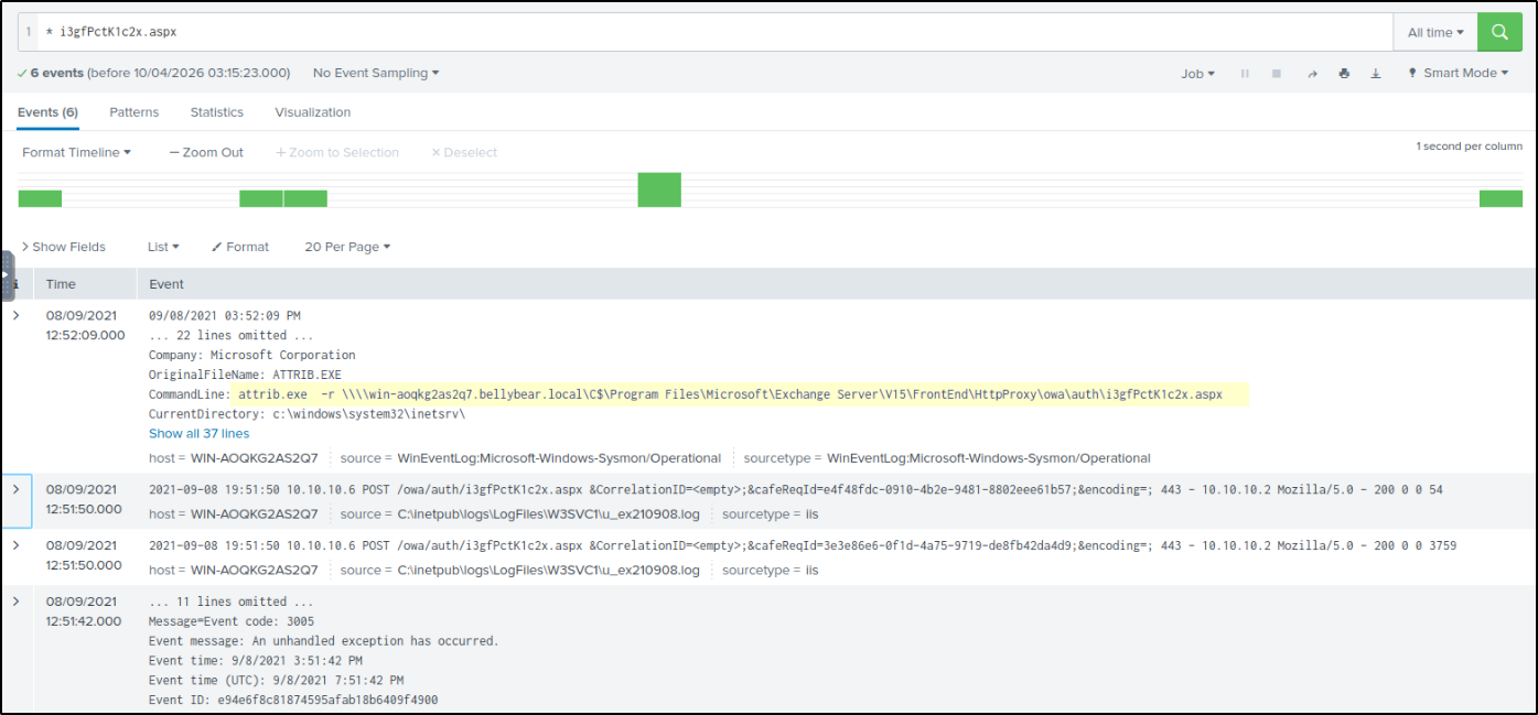 Further correlation with system logs shows a command execution where attrib.exe was used to modify the same .aspx file by removing its read-only attribute.