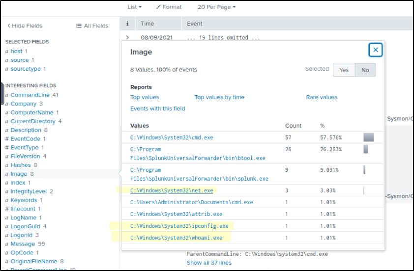 Following this, additional suspicious activity was observed around the same time. We see Images like net, ipconfig, whoami executed