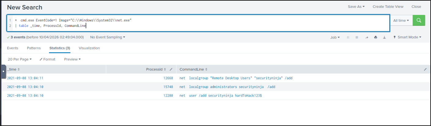 If we observe net.exe related activity. A new user account was created named securityninja and added it to both the Administrators group and Remote Desktop Users group.