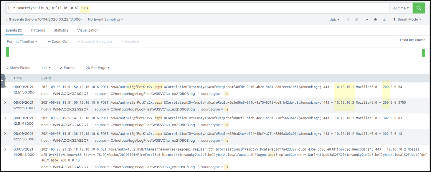 To identify web shell activity, IIS logs were analyzed using the source IP 10.10.10.6. Since the hint suggested a web shell, the focus was on .aspx files, which led to the discovery of a suspicious file /owa/auth/i3gFPcK1c2x.aspx that does not match normal Exchange naming patterns. Multiple POST requests were observed targeting this file, indicating that it was used to upload malicious web shell.